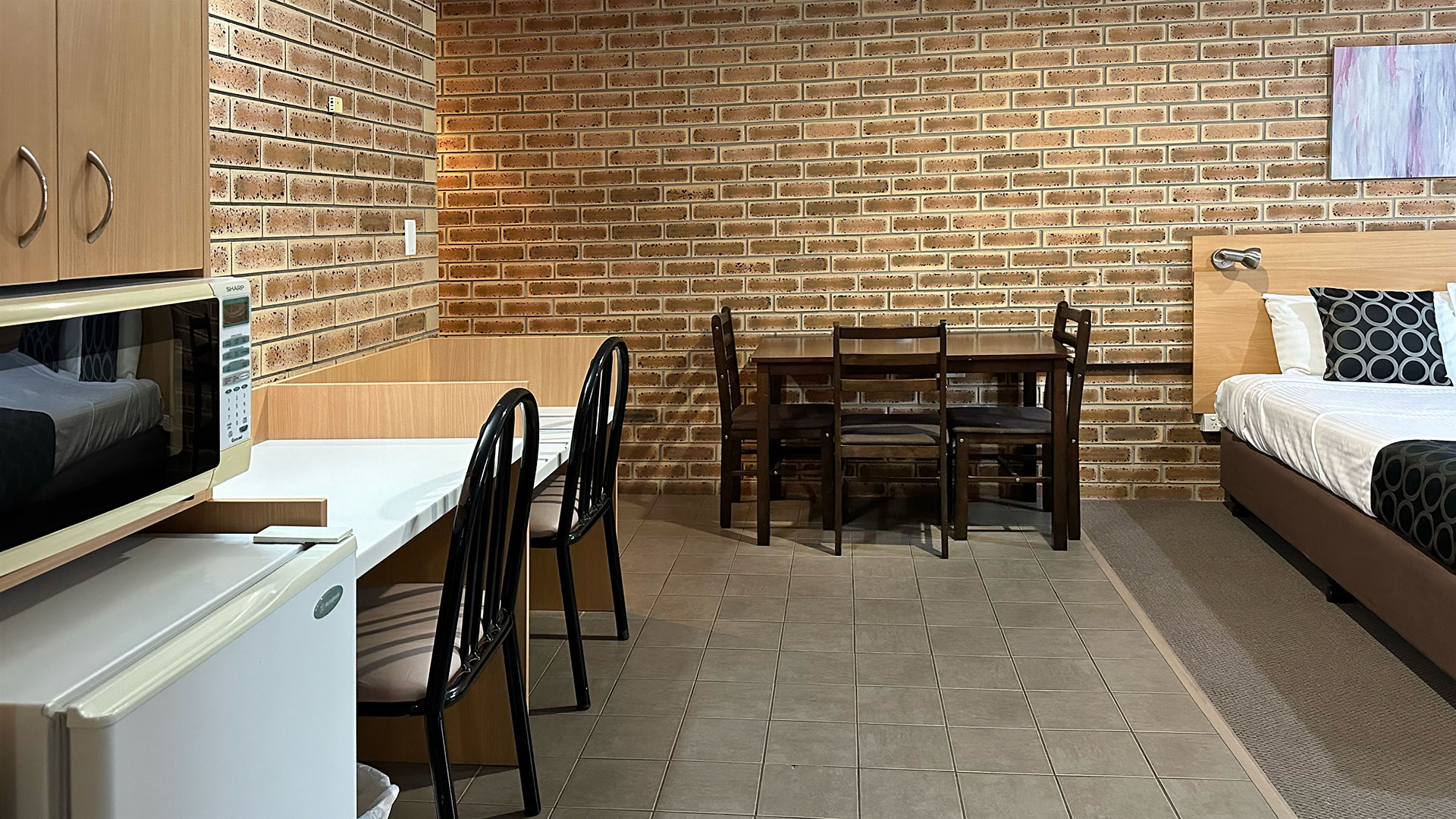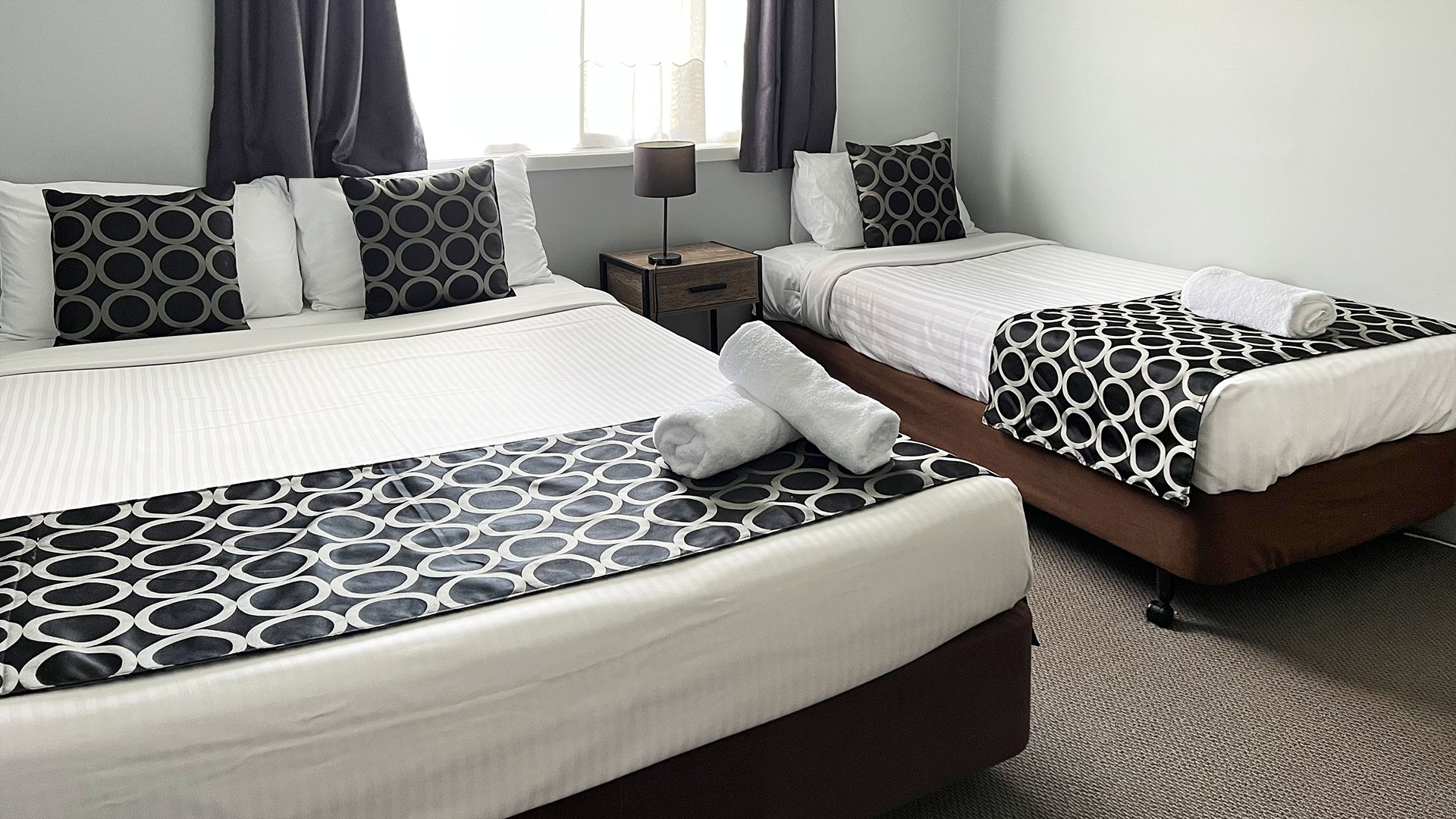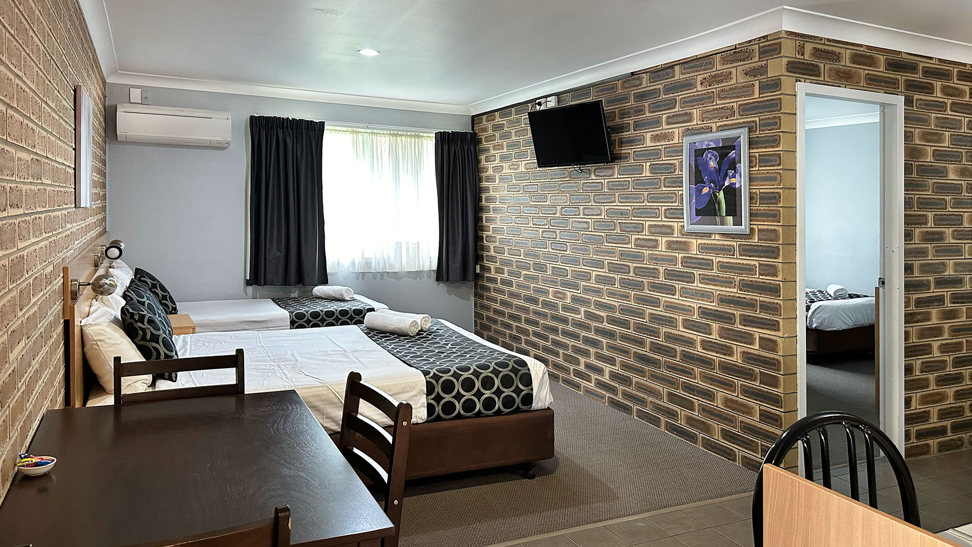 2 Bedroom unit has 2 Queen beds and 2 Single beds, the separate 2nd room with lockable door. With private ensuite and window. Wall mounted Smart TV's, 2 seater lounge, table and chairs, fridge, microwave with crockery and cutley in room.